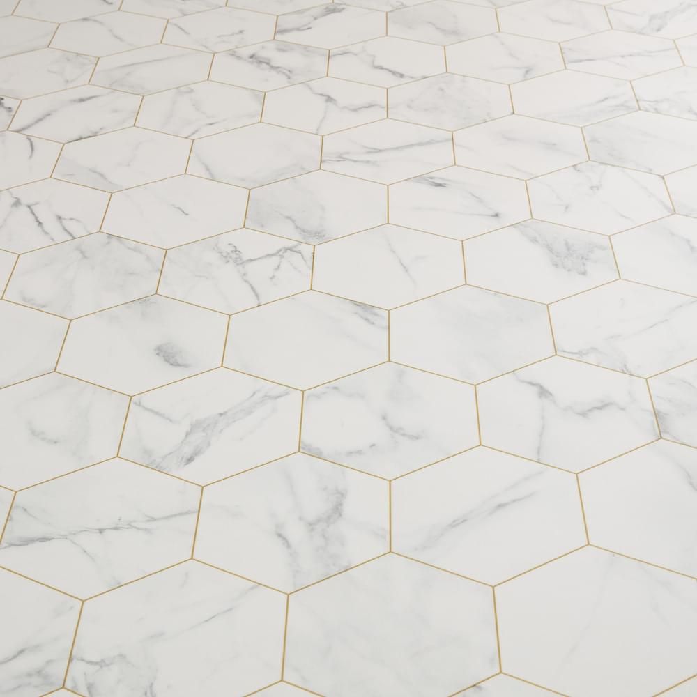 Introducing Carrara Bianca Esagono sheet vinyl flooring. This stunning cushioned vinyl takes inspiration from traditional Italian white marble but set in a hexagon tile design that's been finished with a striking gold grout line. Available in multiple widths, Bianca Esagono is hard wearing, water resistant and easy to maintain. Backed with a 10 year residential guarantee, Carrara sheet vinyl is also slip resistant, insulating and incredibly comfortable underfoot.