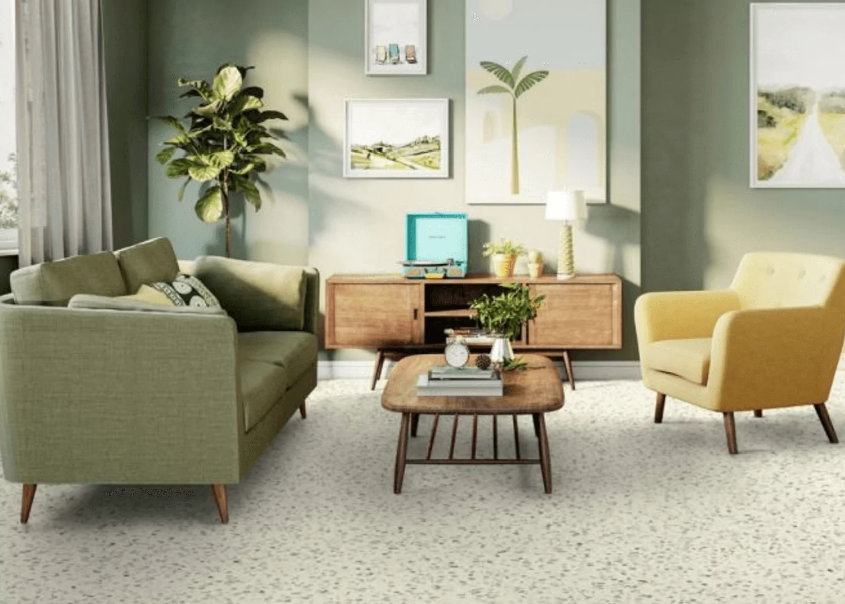 Mid-century modern design is all about clean lines, geometric patterns, and a touch of glamour. Terrazzo sheet vinyl fits perfectly within this style, adding visual interest with its intricate patterns. Pair terrazzo flooring with sleek furniture, chrome or brass accents, and vibrant colours to achieve a mid-century modern look that exudes sophistication.