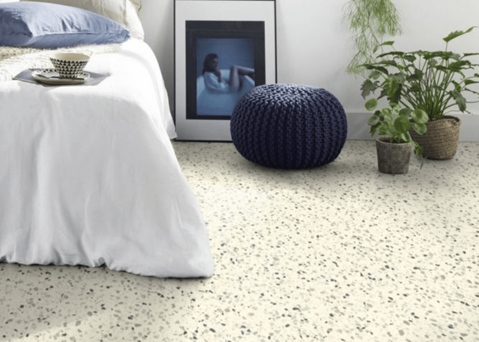Bring warmth and texture to your living room with terrazzo sheet vinyl flooring. Its unique patterns and colours provide a visually engaging foundation that complements various design styles. Enjoy terrazzo for a touch of luxury on a budget without compromising on elegance. Add cosy textiles, comfortable seating, and statement lighting to create a welcoming and stylish living space.