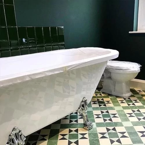 @oxfordartist bathroom renovation suits the Victorian vibe with the regal bathtub and dark walls contrasting with the clear, vibrant greens from the Era Atkinson sheet vinyl flooring.