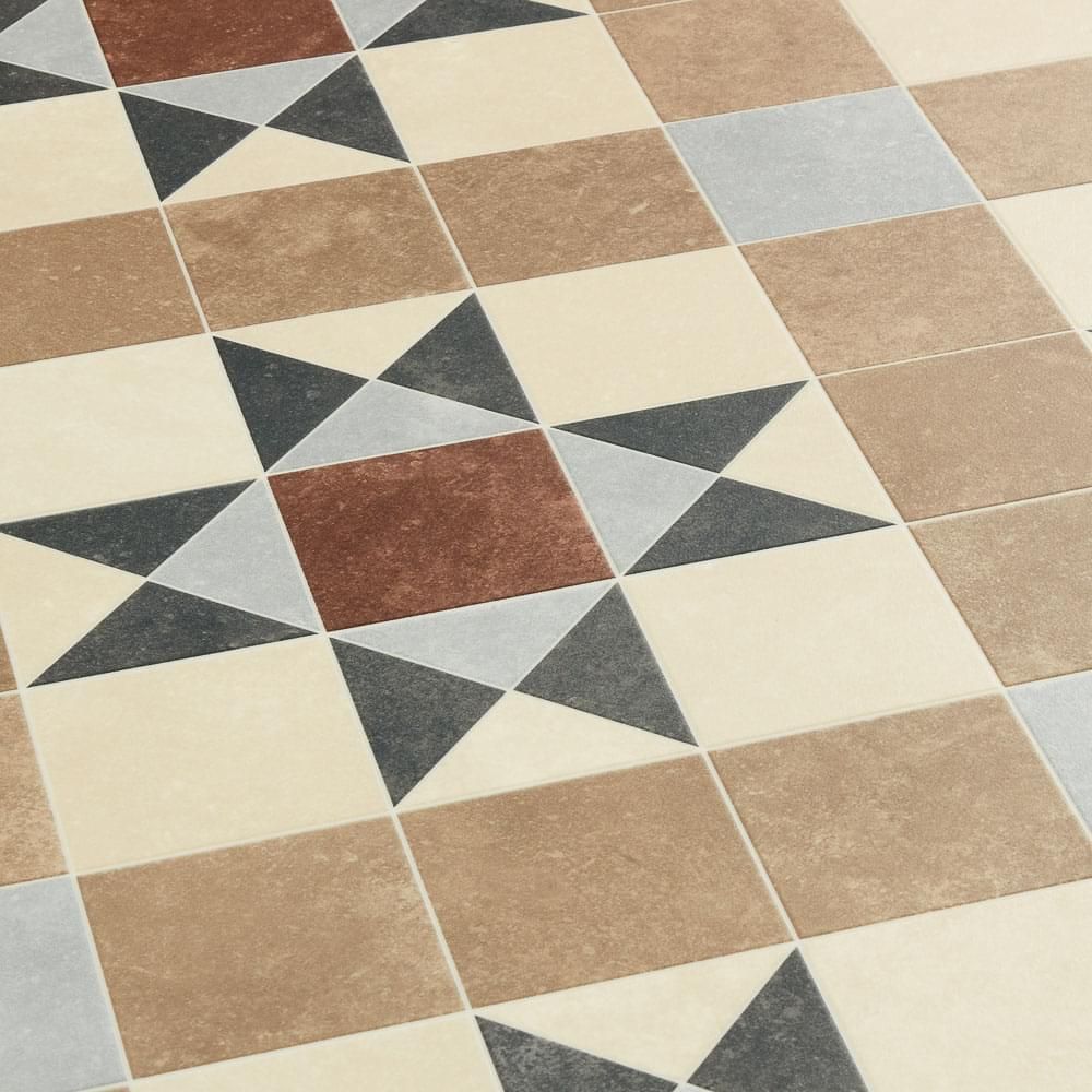 Brindley is a Victorian inspired tessellation of geometric shapes in black, grey, brown and cream. This cushioned, felt backed vinyl floor is easy to install and suited to any residential space.