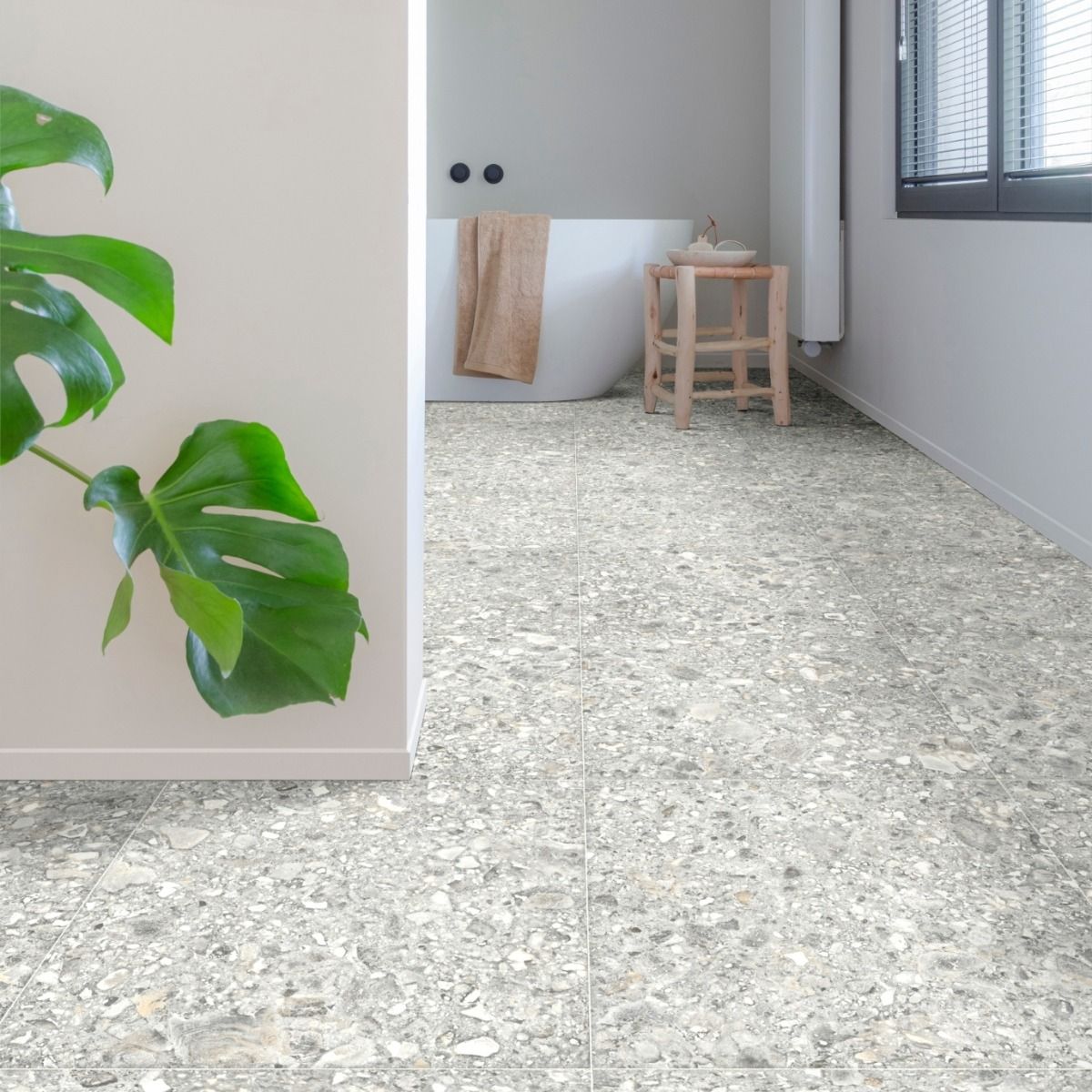 Caliche 594 brings the striking look of terrazzo into a modern, low-maintenance design. With its blend of soft greys and natural stone fragments, this patterned vinyl flooring has a cool, contemporary edge that pairs perfectly with minimalist bathrooms or industrial-inspired kitchens. Light bounces across its textured detail, giving spaces depth and a refined, urban character. A bold yet versatile choice for anyone who wants stone-look flooring with a modern twist.