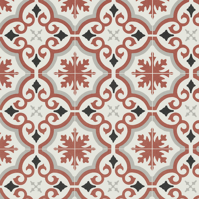Bring warmth and character into your home with Evora 567 patterned vinyl flooring. The rich terracotta tones evoke the sun-drenched beauty of Mediterranean courtyards, creating an inviting atmosphere that feels timeless yet vibrant. Accented with charcoal and soft grey detailing, the intricate pattern captures the elegance of traditional Spanish tile flooring.Bring classic elegance and reliable performance to your home or workspace with Carbontex Evora 567. Its sophisticated design adds character to any room, while the durable 0.4mm wear layer and PU coating provide outstanding protection against scratches, stains, and everyday wear, making it suitable for commercial spaces as well as busy family homes. The slip-resistant R11 surface ensures safety in bathrooms, kitchens or anywhere prone to splashes and spills, giving you peace of mind wherever it’s installed.
