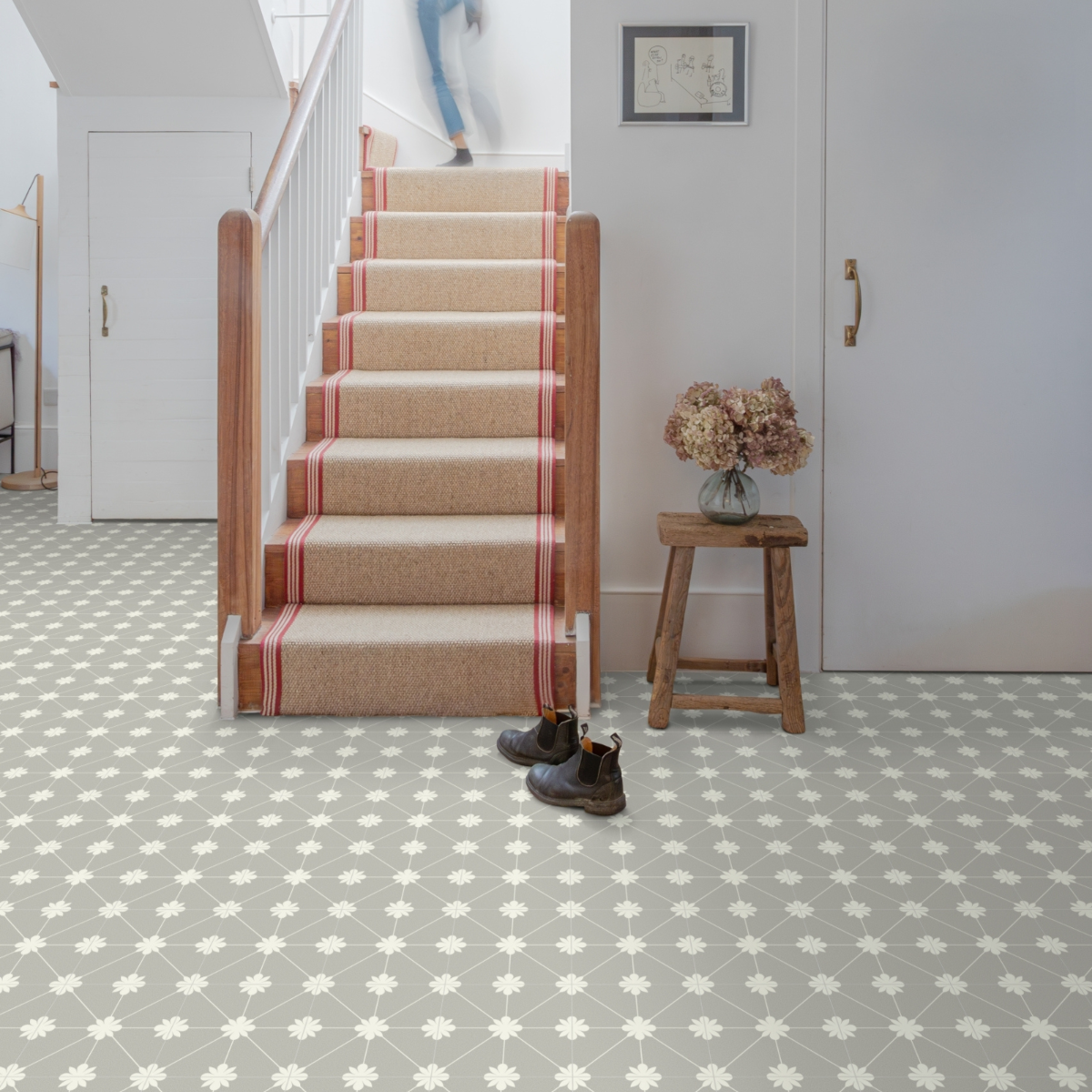 Create a charming, timeless look with Lavender Sheet Vinyl Flooring. Featuring a soft grey background adorned with delicate white floral detailing, this elegant design takes inspiration from classic porcelain tile flooring, bringing a rustic country feel with a touch of vintage charm. Perfect for adding warmth and character to any space, this stunning grey vinyl flooring effortlessly blends classic beauty with modern practicality.