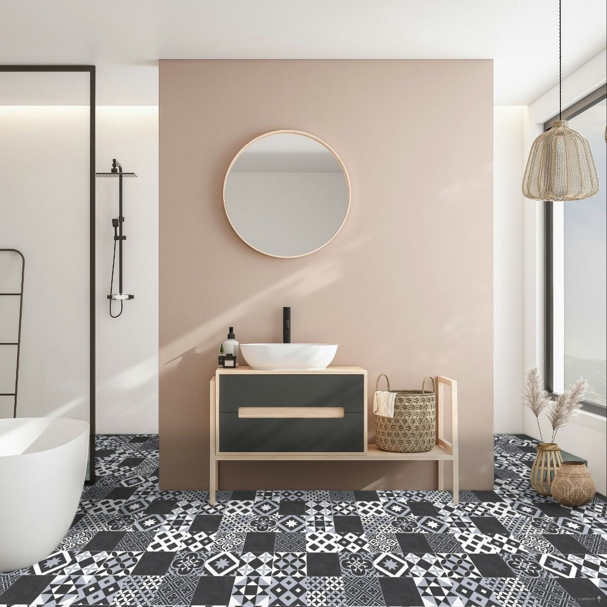 Vivre 90 vintage Portuguese tile design in shades black, grey and white is a high quality sheet vinyl with a 5 year guarantee.