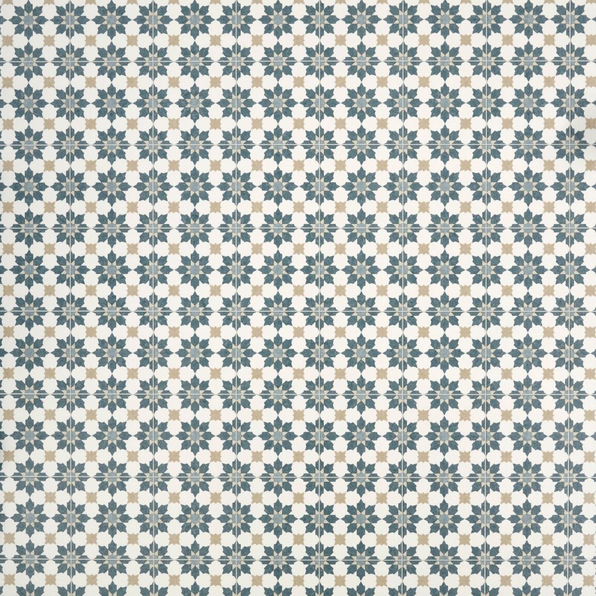 Inspired by the old Moroccan capital Fes' blue architecture. This Larache Sheet Vinyl Flooring design used blues and complimentary sand tones set on a white background.