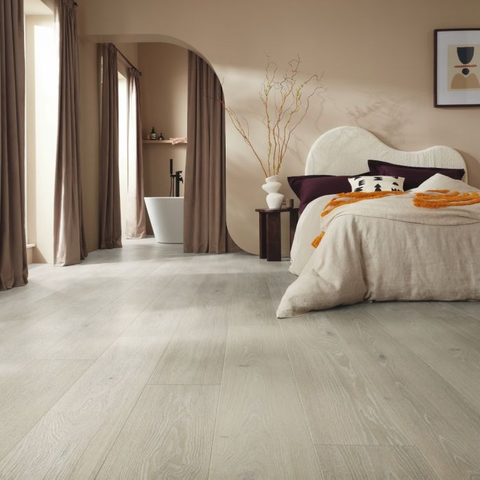 Karndean Clay Artisan Oak RL29 features a beautifully limed and washed finish, showcasing light neutral off-white tones with a hint of warmth that perfectly balances its cool undertones. This characterful oak displays prominent crown formations and burnished knots, adding depth and texture. The liming process accentuates the wood's natural, flowery grain and tight linear markings, while a registered emboss enhances its authenticity and imparts a subtly modern touch.With glue-down installation, each plank or tile is adhered directly to the subfloor, allowing you to customise layouts, patterns, and borders to your liking. This flexibility means you can create a unique look, whether you prefer the simplicity of a straight-lay design or the complexity of a herringbone pattern.