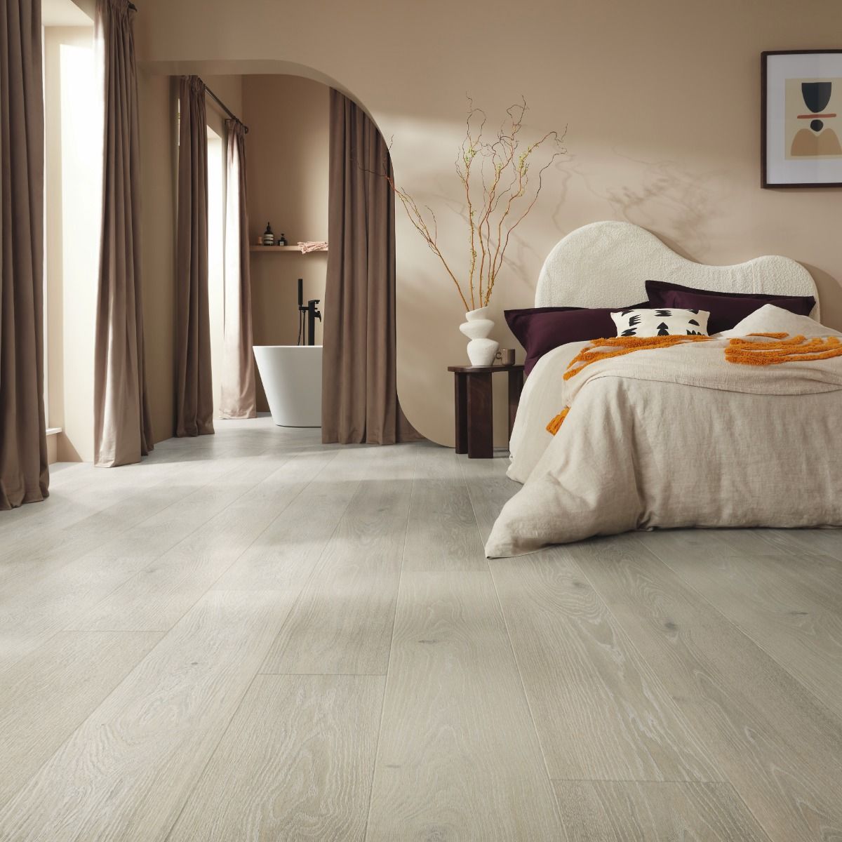 Karndean Clay Artisan Oak RL29 features a beautifully limed and washed finish, showcasing light neutral off-white tones with a hint of warmth that perfectly balances its cool undertones. This characterful oak displays prominent crown formations and burnished knots, adding depth and texture. The liming process accentuates the wood's natural, flowery grain and tight linear markings, while a registered emboss enhances its authenticity and imparts a subtly modern touch.