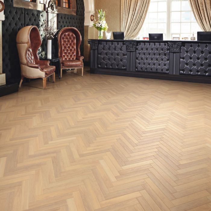 Introducing Savannah Oak SM-RL23, an LVT herringbone flooring that captures the natural beauty of oak with its pale tones and subtle golden hues. The delicate sandy shade running through the grain forms an intricate and attractive pattern, making it a versatile choice for both traditional and contemporary interiors. In its parquet format this stunning vinyl plank flooring can be laid in a classic herringbone pattern, perfect for adding a touch of elegence to any space.Art Select LVT floors represent Karndean's premium collection, featuring handcrafted designs inspired by the finest wood and stone species. This range exemplifies the peak of design expertise with unique embossing and textures, distinctive bevelled edges that highlight each plank and tile, and compelling designs that captivate and inspire.