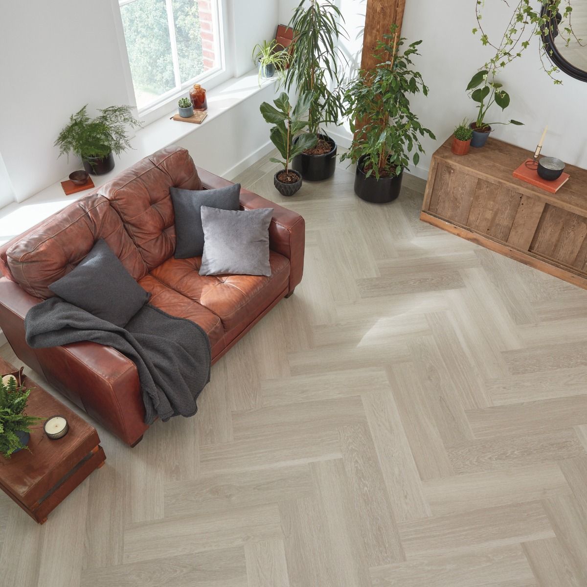 A visually stunning grey vinyl herringbone flooring that seamlessly combines elegance and durability. Its rich and intricate design, complete with natural wood textures and warm tones, creates a timeless aesthetic that enhances any space with its captivating beauty.