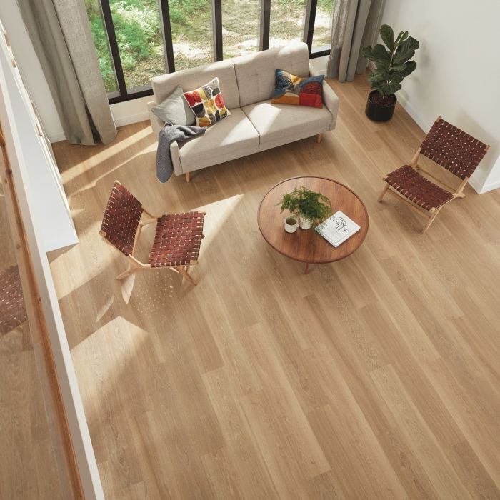 Karndean Warm Brushed Oak flooring boasts a visually captivating aesthetic, featuring subtle golden highlights and an authentic natural feel. The warm tones and brushed texture of the wood effect tiles create a stunning visual appeal, adding depth and character to any room.Featuring a surface resistant to scratches and stains, this flooring is an ideal choice for busy family homes. Its non-porous design simplifies maintenance, giving you time to relax and enjoy your new stunning vinyl flooring. With remarkable impact and abrasion resistance and a lifetime guarantee, it delivers durability and assurance, promising long-lasting beauty for years to come.