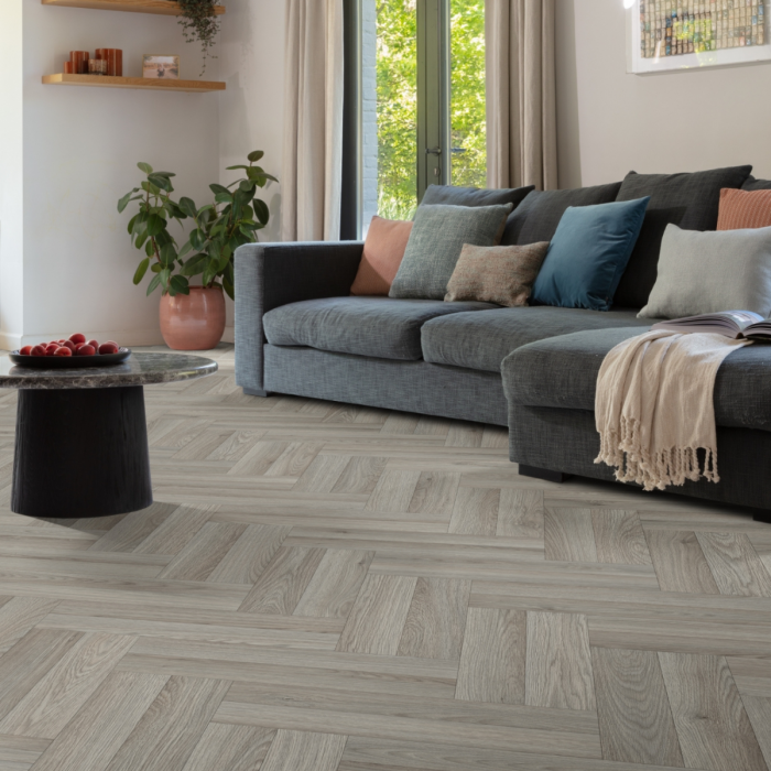 Introducing Grey Birch Parquet Flooring, a timeless choice that combines classic design with contemporary style. With a sophisticated double herringbone pattern, this wood effect vinyl flooring is perfect for adding a touch of excitement to minimalist interiors. The subtle grey palette features authentic hints of muted brown running through the planks, creating a sheet vinyl flooring that effortlessly captures the character of natural wood.The Lambert range offers an exquisite selection of wood-effect designs, combining the timeless beauty of natural wood with the practicality of modern linoleum flooring. Each design is crafted to deliver an authentic, characterful aesthetic, capturing the rich grains and textures of real hardwood while providing the durability, comfort, and easy maintenance that only a vinyl roll can offer.