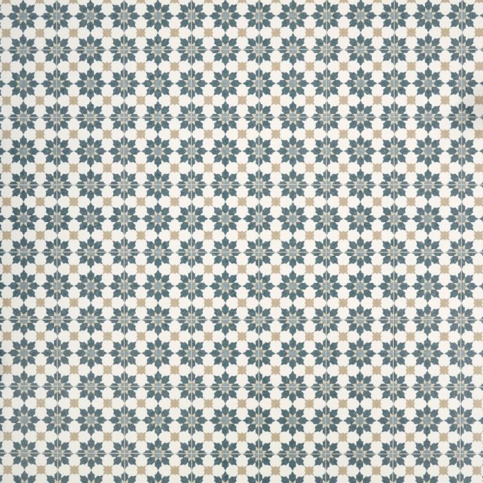 Inspired by the old Moroccan capital Fes' blue architecture. This Larache Sheet Vinyl Flooring design used blues and complimentary sand tones set on a white background.Larache Fes is inspired by the old Moroccan capital city. Blue is a widely used colour in Morocco, and this trellis tile design also uses complementary gold and sand accent tiles.
