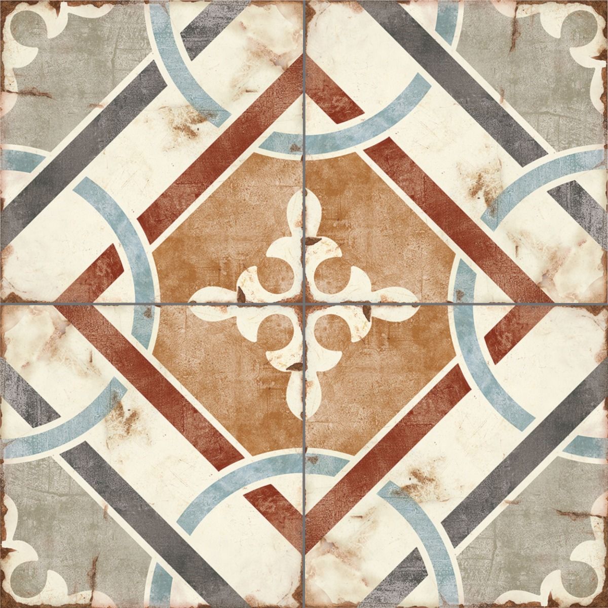 Looking for a geometric patterned tile to finish your interior? Look now further than Loft Parma. This aged tile is a vibrant mix of blues, reds, greys and whites set in a classic diamond design and finished with light blue circles that will add the wow factor to any home.