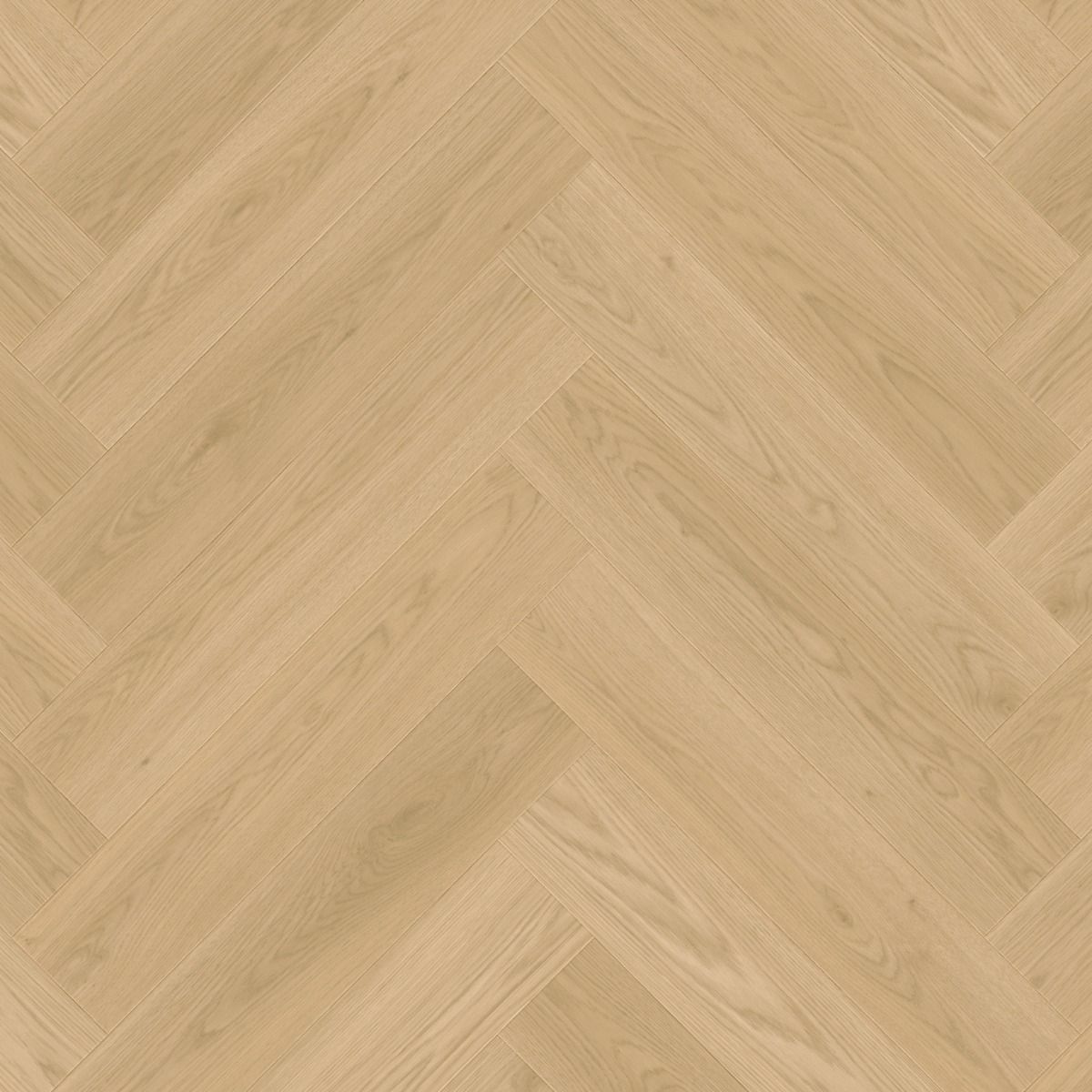 Moduleo LayRed Herringbone Dingle Oak 13340 vinyl plank flooring combines pale sandy oak tones with subtle warmth for a light and inviting feel. A mix of straight and flowery grains creates a natural, authentic look, enhanced by registered embossing where the surface texture perfectly matches the design. This oak effect parquet vinyl flooring delivers both realism and charm, offering a floor that looks and feels as genuine as authentic hardwood flooring. Upgraded in 2025 with a genuine bevel, enhanced texture, and a sleek matte finish that captures the beauty of natural materials. The improved waterproof click system keeps water from seeping through the joints for extra durability and peace of mind.