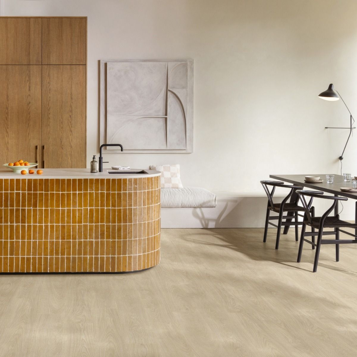 Moduleo LayRed Laurel Oak 51230 luxury vinyl floor tiles showcase a stunning blend of muted sandy tones with swirling grains and delicate hints of grey and beige. This natural oak LVT flooring is enhanced with registered embossing, bringing the authentic depth and character of real timber to life. With its dynamic patterning and timeless palette, this oak-inspired floor creates a captivating foundation that energises a room while maintaining a classic, sophisticated feel. Upgraded in 2025 with a genuine bevel, enhanced texture, and a sleek matte finish that captures the beauty of natural materials. The improved waterproof click system keeps water from seeping through the joints for extra durability and peace of mind.