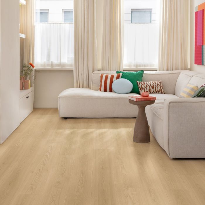 Moduleo LayRed Dingle Oak 13340 vinyl flooring tiles combine pale sandy oak tones with subtle warmth for a light and inviting feel. A mix of straight and flowery grains creates a natural, authentic look, enhanced by registered embossing where the surface texture perfectly matches the design. This oak effect vinyl flooring delivers both realism and charm, offering a floor that looks and feels as genuine as traditional wood flooring. Upgraded in 2025 with a genuine bevel, enhanced texture, and a sleek matte finish that captures the beauty of natural materials. The improved waterproof click system keeps water from seeping through the joints for extra durability and peace of mind.Moduleo LayRed Flooring is Moduleo’s flagship range, crafted as a Rigid Vinyl Flooring With Integrated Underlay. The integrated underlay and advanced click system work in harmony, making installation simple and stress-free. This vinyl click flooring provides a strong, reliable foundation that combines durability with effortless installation, making it perfect for modern interiors.