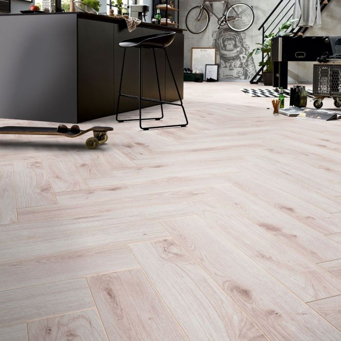Lighten up your home with New Forest Pale Oak. The bright white oak wood colours and detailed wood grains help transform any living room, hallway and bedroom area.New Forest is a collection of stunning laminate oak wood designs in a luxurious herringbone pattern. They are long planks that come packaged in a box of A + B planks.