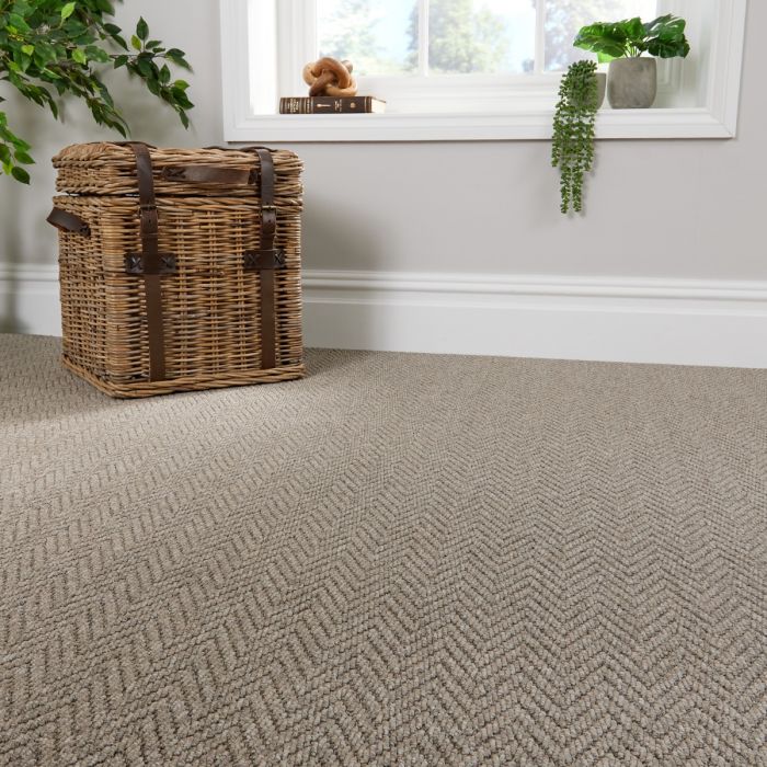 Transform your home with Odin Iverson Greige Patterned Carpet. Its captivating herringbone design and flecked berber fibres perfectly blend with its neutral colour palette, offering a versatile flooring solution that compliments a variety of interiors. Crafted with precision, Iverson is a stunning luxury carpet that effortlessly combines style with industry-leading performance.The Odin collection is perfect for those seeking a versatile ploop pile carpet with a natural and complimentary colour scheme. The dense and hard-wearing fibres create a textured chevron design, adding a captivating focal point to any interior. As the perfect combination of form and function, Odin carpets come with a 5-year warranty, giving you confidence in your investment.