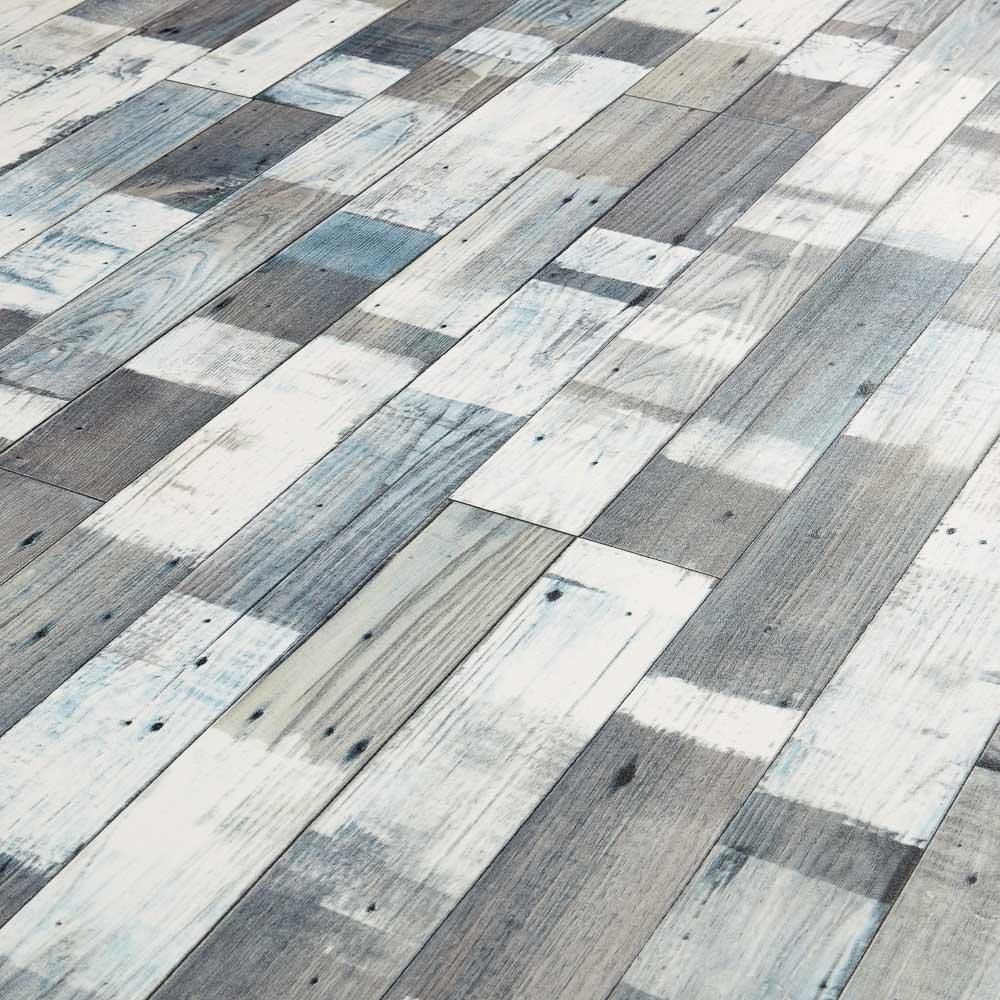 Add character to your home with the Snow painted wood sheet flooring. This mix of Blue and White distressed wood offers an authentic look and is non-slip as well as water resistant making it the perfect choice for Kitchen and Bathroom installations. This vinyl comes with a 5 year domestic warranty and is available in 2 and 3 metre wide.