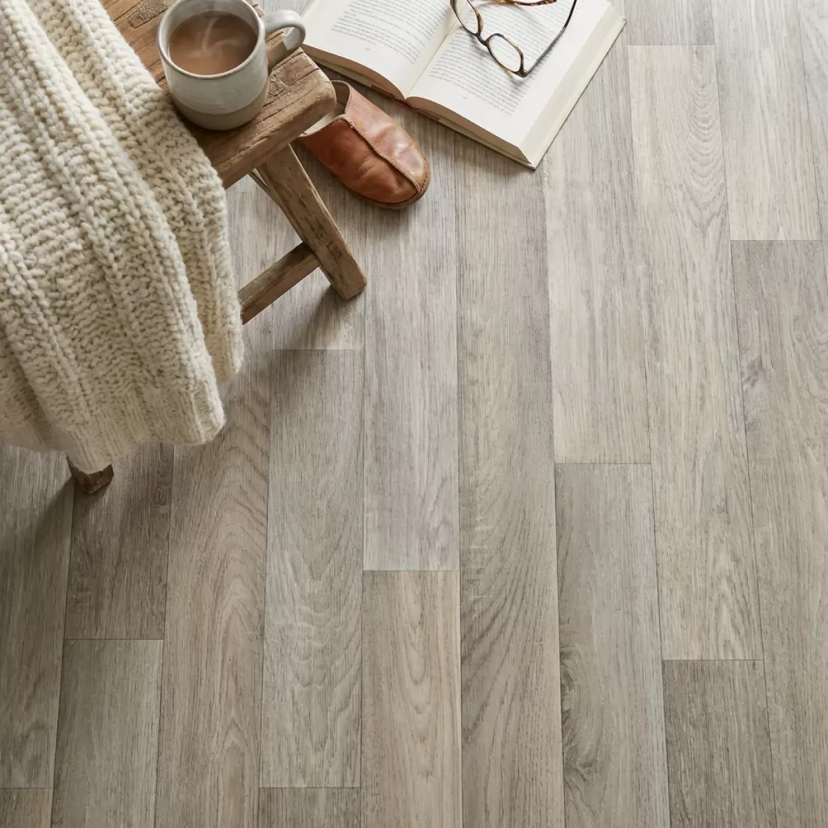 Spectrum Carpow Oak Sheet Vinyl Flooring pairs contemporary grey tones with a rustic, saw-cut texture for a bold yet refined finish. Subtle weathering and layered grain detail create an authentic wood character, elevated by a soft metallic sheen that catches the light beautifully. Blending a grey wood effect with it's durable vinyl flooring performance, Carpow Oak is perfect for modern bathroom and kitchen spaces that demand style without compromising practicality.Enjoy the authentic look of natural wood flooring for a fraction of the cost with Spectrum Carpow Oak. Designed to replicate the warmth and texture of real timber, this affordable vinyl flooring features a realistic surface finish and brings everyday practicality to contemporary homes.