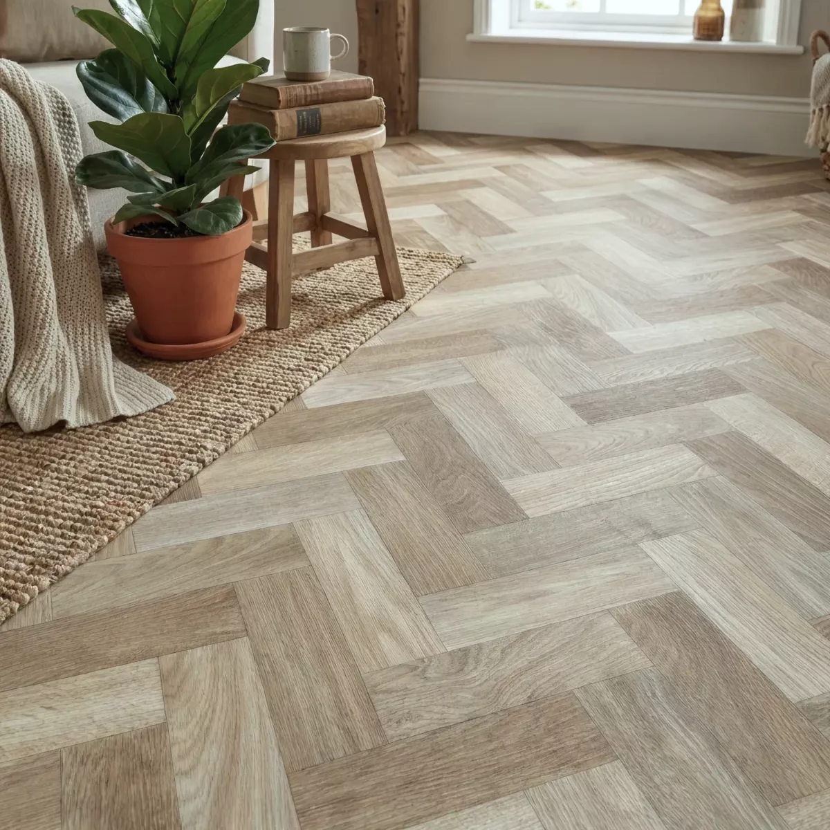 Spectrum Warfield Small Herringbone sheet vinyl flooring will impress with its realism and beauty. The herringbone design is varied in colour with subtle browns, greys and beige parquet blocks. All the products in our Spectrum sheet vinyl flooring range have a comfort backing with a durable and non-slip surface wear layer.