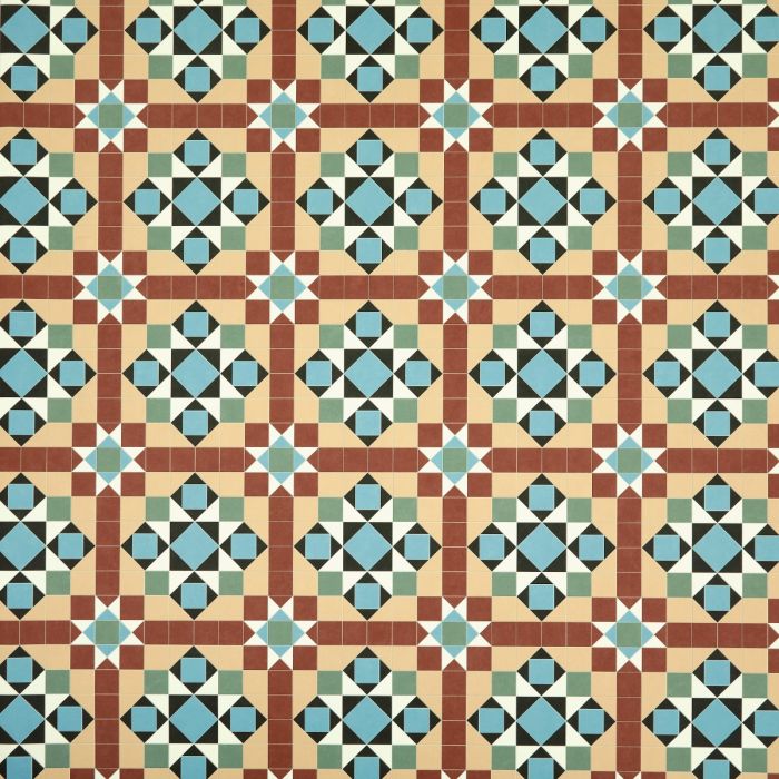 Barton is a Victorian inspired tessellation of geometric shapes in browns, blacks and whites, with green and blue highlights. This cushioned, felt backed vinyl floor is easy to install and suited to any residential space.Give your home a touch of Victorian elegance with Parson from ERA, our exclusive collection of Victorian-inspired contemporary geometric flooring. The Parson design features a tessellation of brown, black, and white ceramic-effect tiles, accented with blue and green highlights to create a striking star-and-square pattern. This captivating design adds a timeless Victorian character to any hallway or residential space, including conservatories. With its felt backing, this easy-to-install sheet flooring can be laid over many existing subfloors.